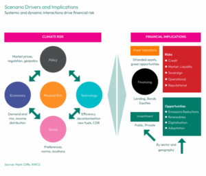 Studies have shown that current scenario analysis practices are not capturing the full extent of climate impacts for financial firms. The Climate Financial Risk Forum (CFRF) and the Network for Greening the Financial System (NGFS) highlight the importance of evolving practice in scenario analysis, combining the latest modelling with real-world narratives to ensure firms are aware of the potential implications. For example, models can forecast temperate increases that could result in floods or wildfires, or both. Narratives can ask the questions: what would resulting tech disruption or a surge in stranded assets mean for credit lines and asset managers? How might boards have to pivot strategy to rebalance portfolios and ensure firms navigate turbulent markets?
